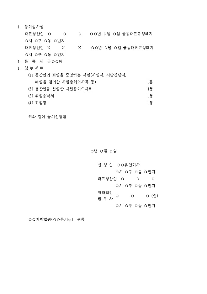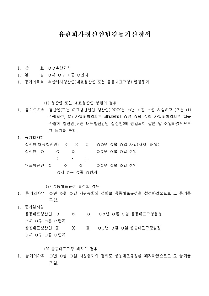 유한회사청산인(대표청산인 또는 공동대표규정) 변경등기(청산인 또는 대표청산인 경질의 경우, 공동대표규정 설정의 경우)를 위한 유한회사청산인변경등기신청서 양식입니다.