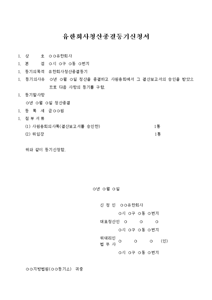 9,000원/월청산을 종결하고 사원총회에서 그 결산보고서의 승인을 받았으므로 그에 대한 등기를 구할 때 사용하는 유한회사청산종결등기신청서 양식입니다.