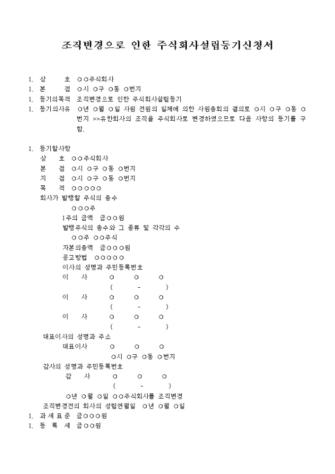 사원 전원의 일체에 의한 사원총회의 결의로 회사의 조직을 주식회사로 변경하였으므로 그에 대한 등기를 구할 때 사용하는 조직변경으로 인한 주식회사설립등기신청서 양식입니다.
