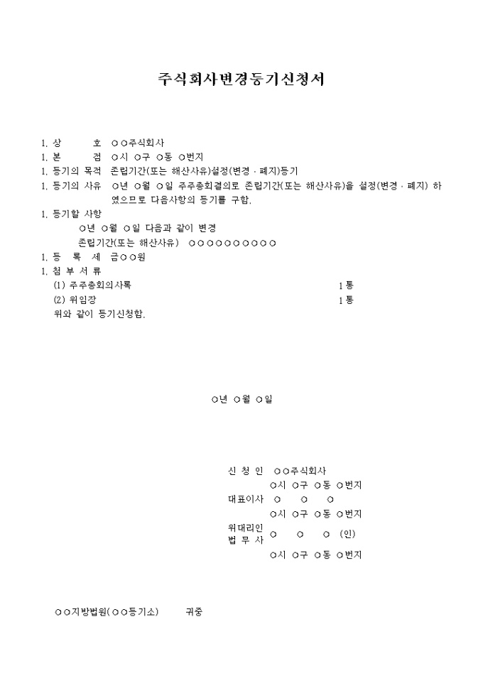 9,000원/월주주총회결의로 존립기간(또는 해산사유)을 설정(변경폐지)하였으므로 그에 대한 등기를 구할 때 사용하는 주식회사변경등기신청서양식입니다.
