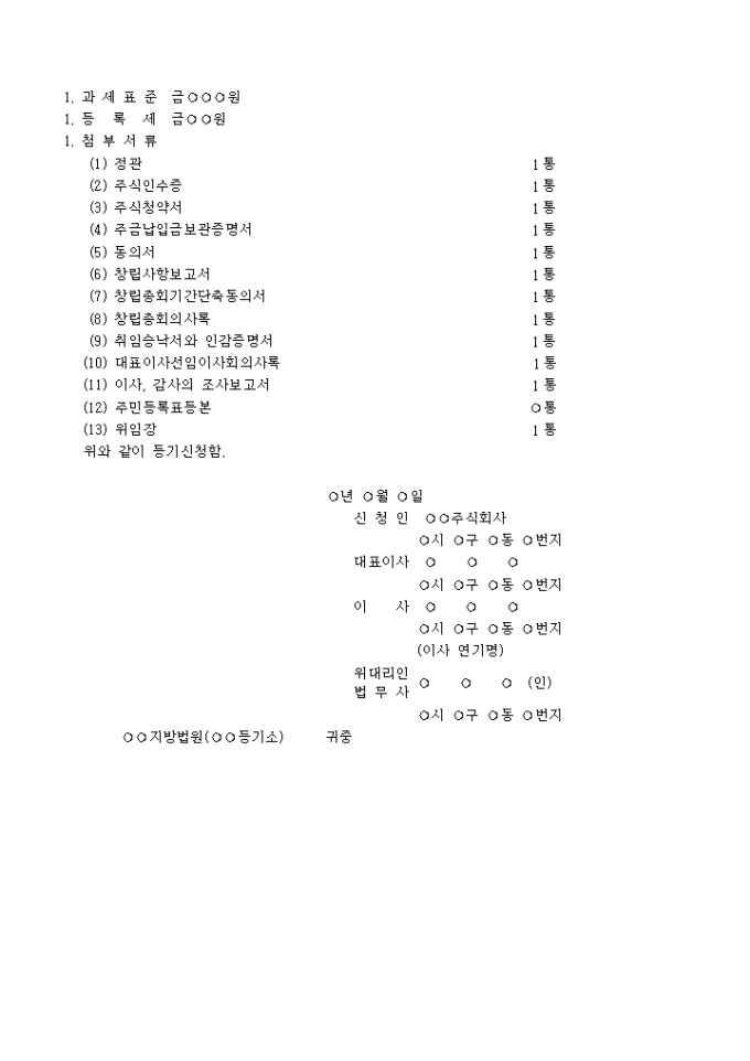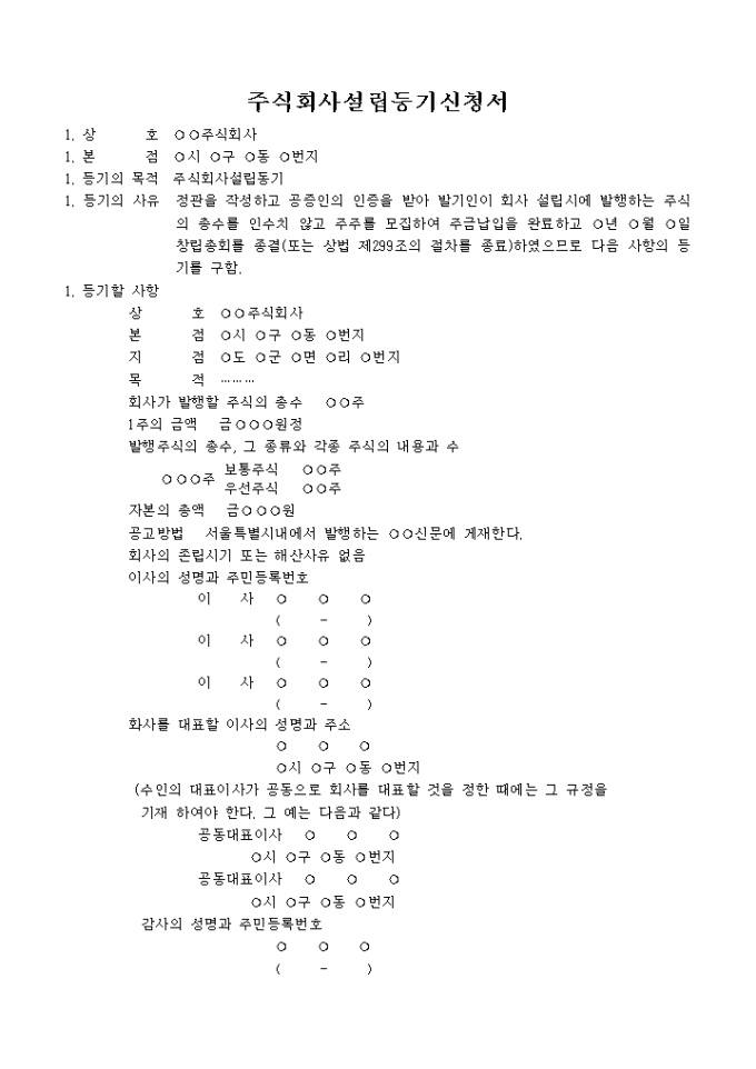 정관을 작성하고 공증인의 인증을 받아 발기인이 회사 설립시에 발행하는 주식의 총수를 인수치 않고 주주를 모집하여 주금납입을 완료하고 창립총회를 종결(또는 상법 제299조의 절차를 종료)하였으므로 그에 대한 등기를 구할 때 사용하는 주식회사설립등기신청서양식입니다.