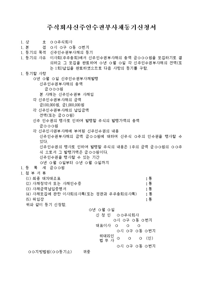 9,000원/월이사회(주주총회)에서 신주인수권부사채의 총액을 모집하기로 결의하고 그 모집을 완료하여 각 신주인수권부사채의 전액(또는 1회)납입을 완료하였으므로 그에 댛나 등기를 구할 때 사용하는 주식회사신주인수권부사채등기신청서 양식입니다.