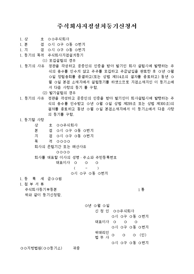 주식회사지점설치등기(모집설립의 경우, 발기설립의 경우)를 위한주식회사지점설치등기신청서 양식입니다.