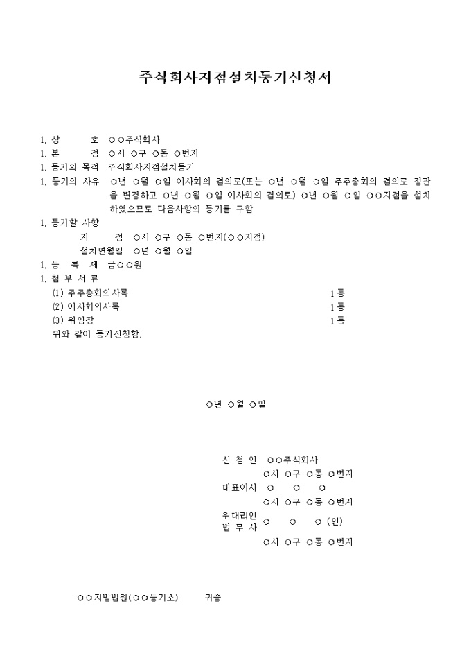 이사회의 결의로(또는 주주총회의 결의로 정관을 변경하고 이사회의 결의로) 지점을 설치 하였으므로 이에 대한등기를 구할 때 사용하는 주식회사지점설치등기신청서 양식입니다.