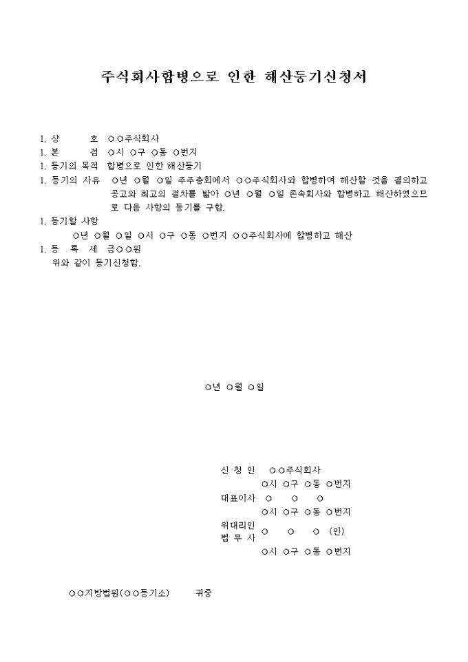 9,000원/월주주총회에서 주식회사와 합병하여 해산할 것을 결의하고 공고와 최고의 절차를 밟아 존속회사와 합병하고 해산하였으므로 그에 대한 등기를 구할 때 사용하는 주식회사합병으로 인한 해산등기신청서 양식입니다.