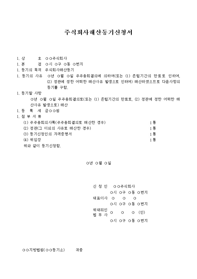 9,000원/월주주총회결의에 의하여(또는 존립기간의 만료로 인하여, 정관에 정한 어떠한 해산사유 발생으로 인하여) 해산하였으므로 그에 대한 등기를 구할때 사용하는 주식회사해산등기신청서 양식입니다.