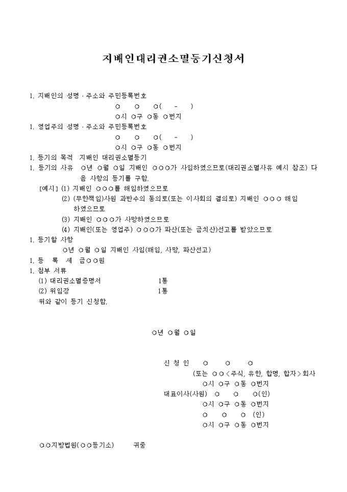 지배인대리권소멸등기신청서(사임 해임 지배인의 사망 파산 금치산 기타 지배인의 대리권소멸의 경우)