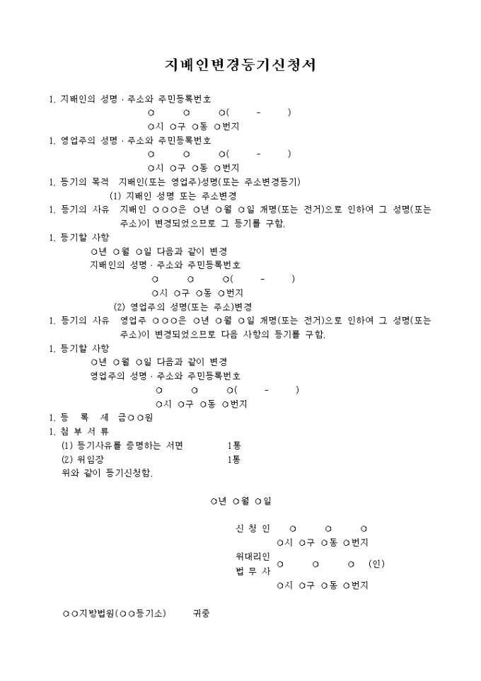 지배인변경등기신청서(지배인이나 영업주의 성명변경의 경우)