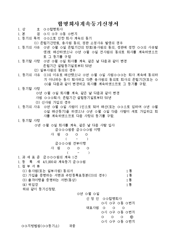 9,000원/월합병으로 인한 회사 계속의 동기(존립기간만료, 총사원 동의, 정관 소정사유 발생의 경우, 일부사원의 동의의 경우, 신사원 가입의 경우)를 위한 합명회사계속등기신청서 양식입니다.