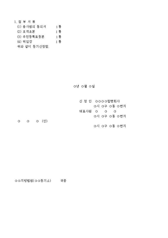 총사원의 동의로 상호를 다음과 같이 변경하였으므로 그에 대한 등기를 구할 때 사용하는 합명회사변경등기신청서양식입니다.