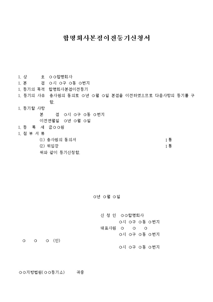 합명회사본점이전등기를 위한 합명회사본점이전등기신청서양식입니다.