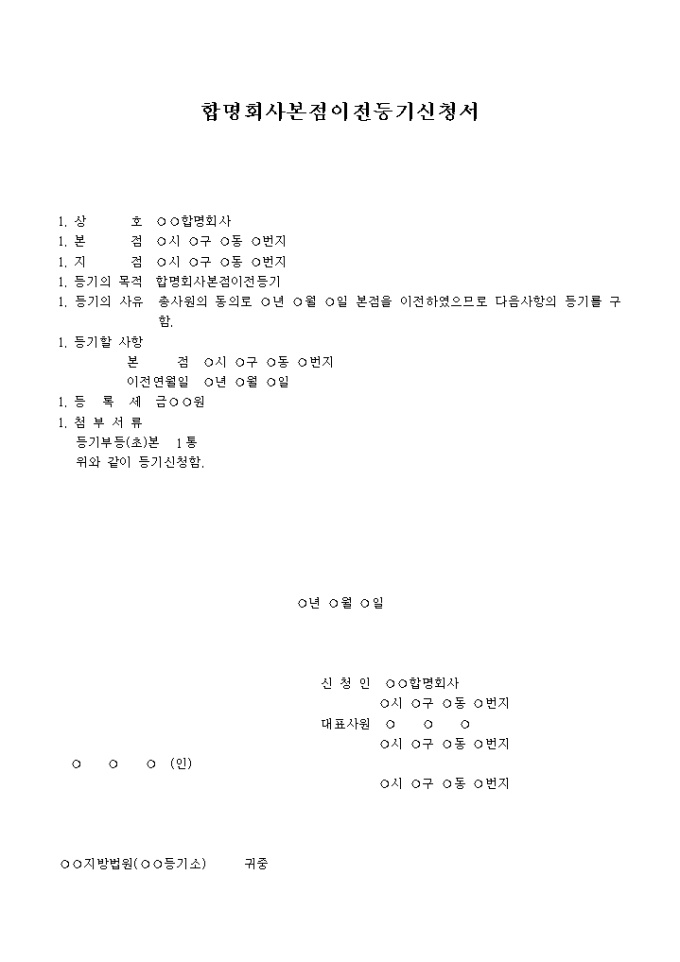 총사원의 동의로 본점을 이전하였으므로 그에 대한 등기를 구할 때 사용하는 합명회사본점이전등기신청서양식입니다.