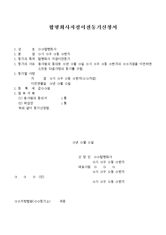 총사원의 동의로 지점을 이전하였으므로 그에 대한 등기를 구할 때 사용하는 합명회사지점이전등기신청서양식입니다.