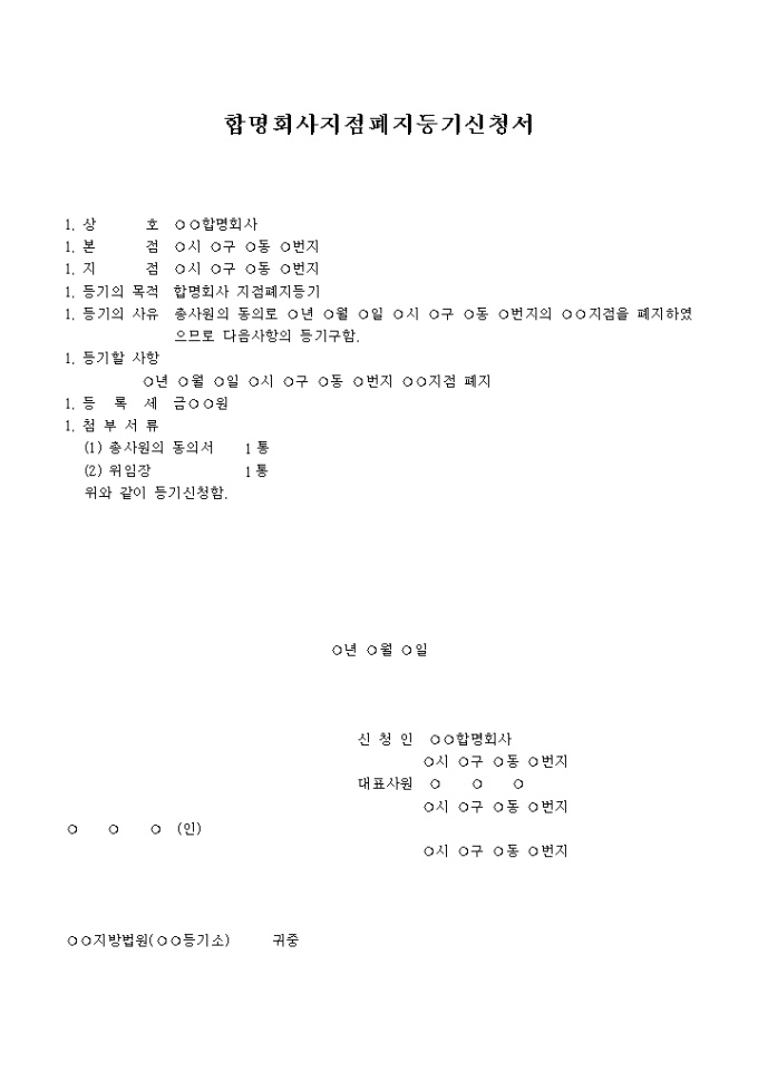 총사원의 동의로 지점을 폐지하였으므로 그에 대한 등기구할 때 사용하는 합명회사지점폐지등기신청서 양식입니다.