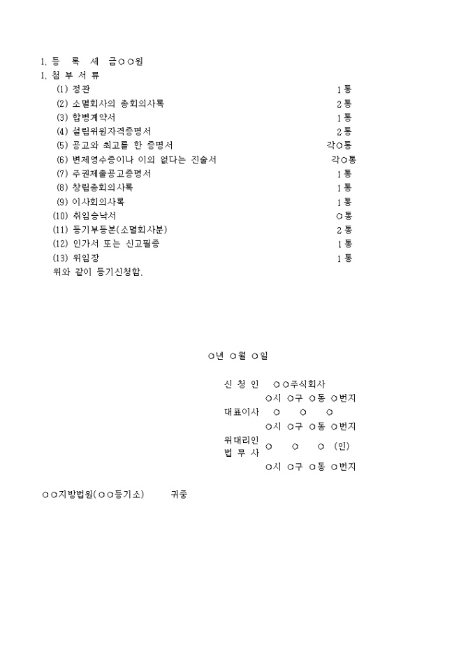 9,000원/월oo주식회사와 xx주식회사가 합병하고 새로운 주식회사를 설립하기 위하여 각 주주총회에서 각기 합병결의를 하고 설립위원을 선임하여 정관을 작성하고 공고와 최고절차를 밟아 창립총회를 종결 하였으므로 그에 대한 등기를 구힐 때 사용하는 합병으로 인한 주식회사설립등기신청서양식입니다.