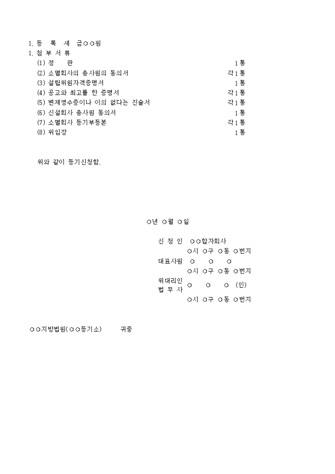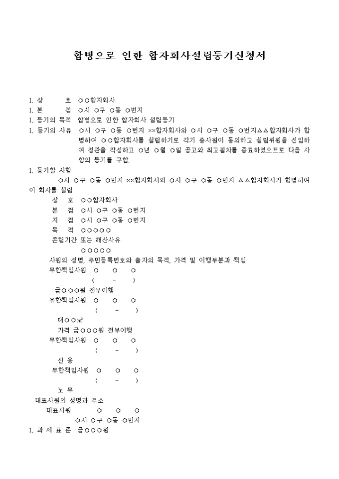 9,000원/월oo합자회사와 xx합자회사가 합병하여 새로운 합자회사를 설립하기로 각기 총사원이 동의하고 설립위원을 선임하여 정관을 작성하고 공고와 최고절차를 종료하였으므로 그에 대한 등기를 구할 때 사용하는 합병으로 인한 합자회사설립등기신청서 양식입니다.
