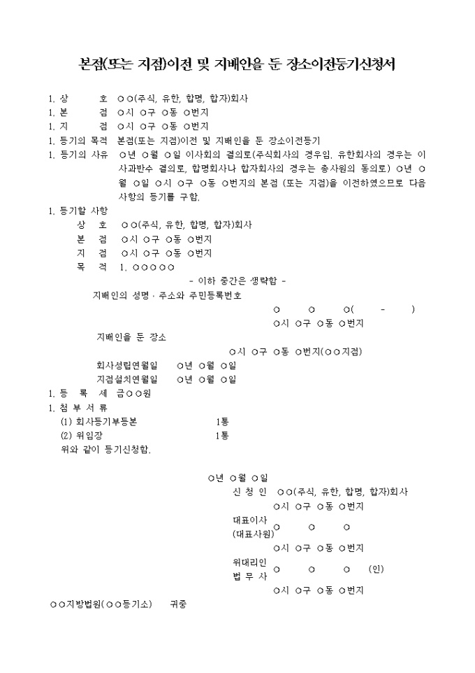 9,000원/월본점(또는 지점)이전 및 지배인을 둔 장소이전을 위한 회사 본점(또는 지점)이전 및 지배인영업소이전등기신청서양식입니다.