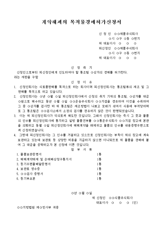 9,000원/월신청인으로부터 피신청인에게 인도하여야 할 통조림 ○상자의 경매를 요청할 때 사용하는 계약해제의 목적물경매허가신청서양식입니다.