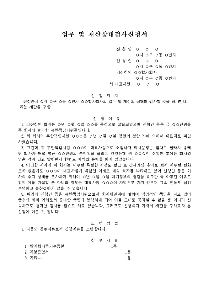 업무 및 재산상태검사신청서양식입니다.