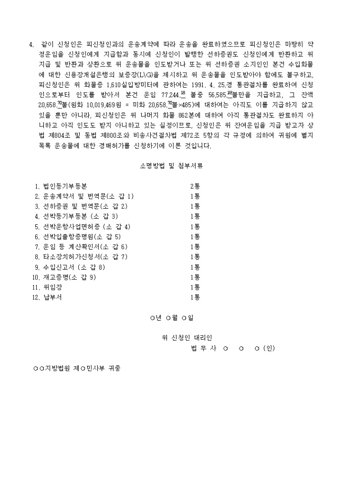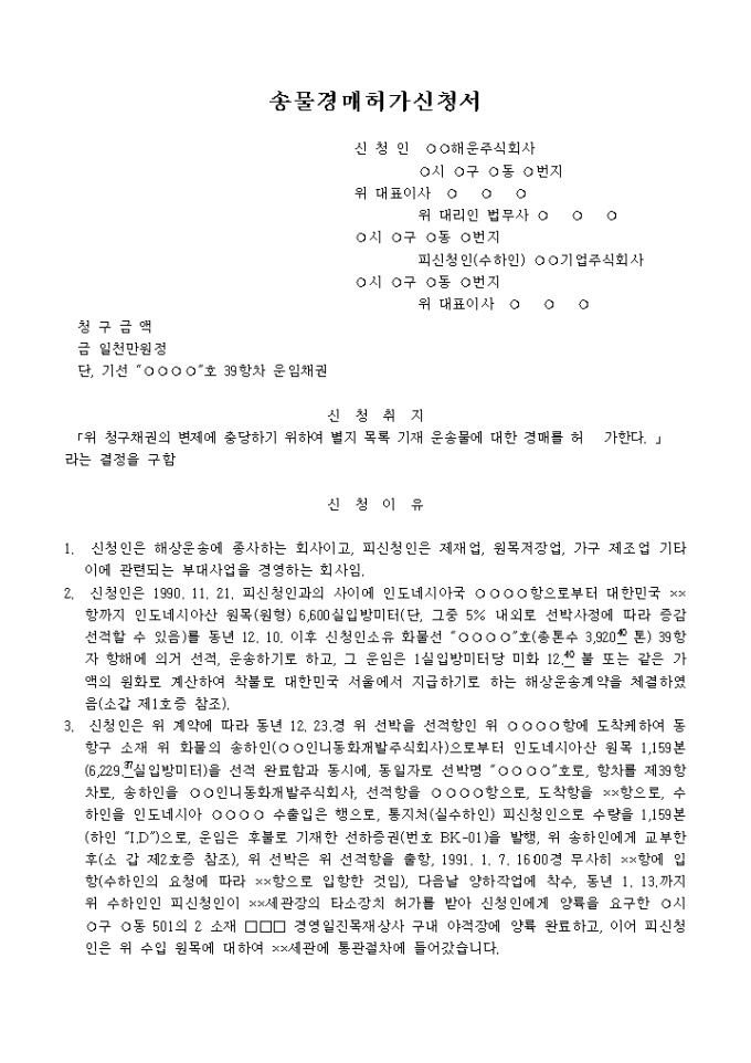 9,000원/월청구채권의 변제에 충당하기 위하여 별지 목록 기재 운송물에 대한 경매를 허가요청할 때 사용하는 운송물경매허가신청서 양식입니다.