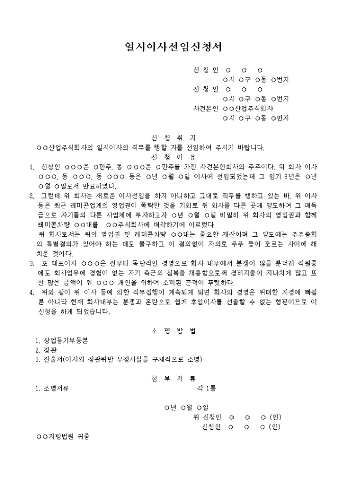 이사직무대행자선임신청서(이해관계인) 예제 입니다. 신 청 이 유 1. 신청인 은 만주, 동 은 만주를 가진 사건본인회사의 주주이다. 위 회사 이사 , 동 , 동 등은 년 월 일 이사에 선임되었는데 그 임기 3년은 년 월 일로서 만료하였다. 2. 그런데 위 회사는 새로운 이사선임을 하지 아니하고 그대로 직무를 행하고 있는 바, 위 이사 등은 최근 레미콘업계의 영업권이 폭락한 것을 기회로 위 회사를