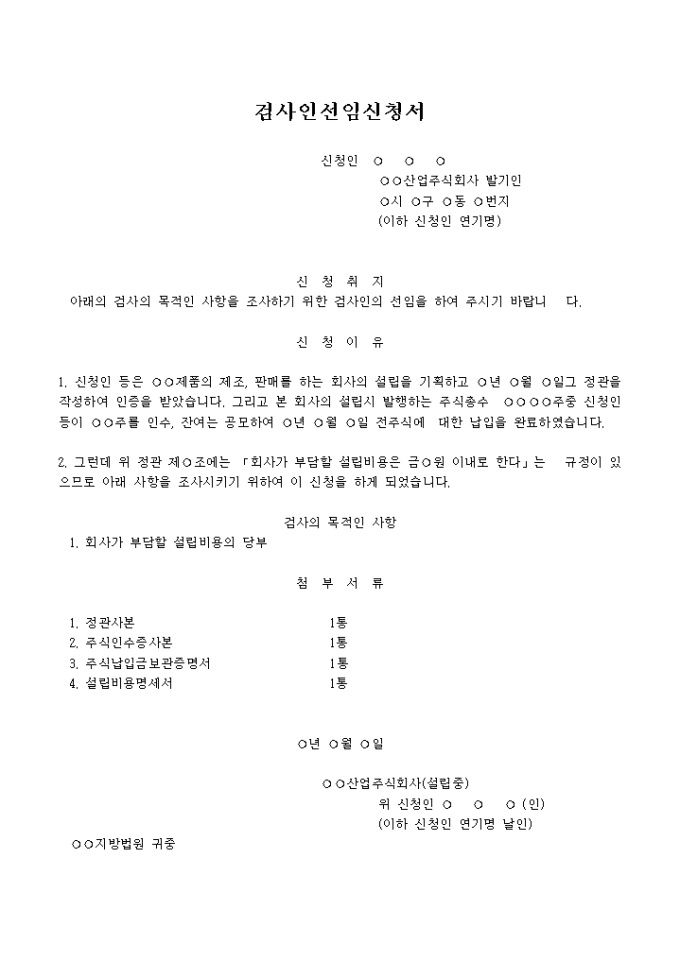 주식회사 모집설립(설립비용)검사인선임신청서