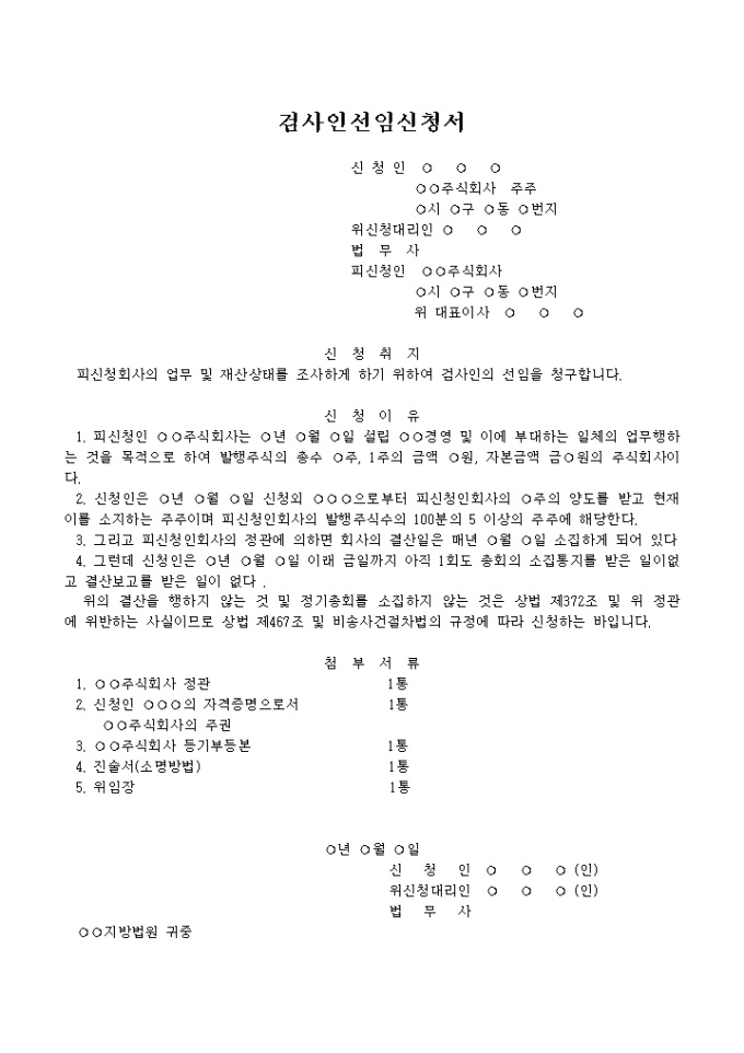 피신청회사의 업무 및 재산상태를 조사하게 하기 위하여 검사인의 선임을 청구할 때 사용하는 검사인선임신청서 양식입니다.