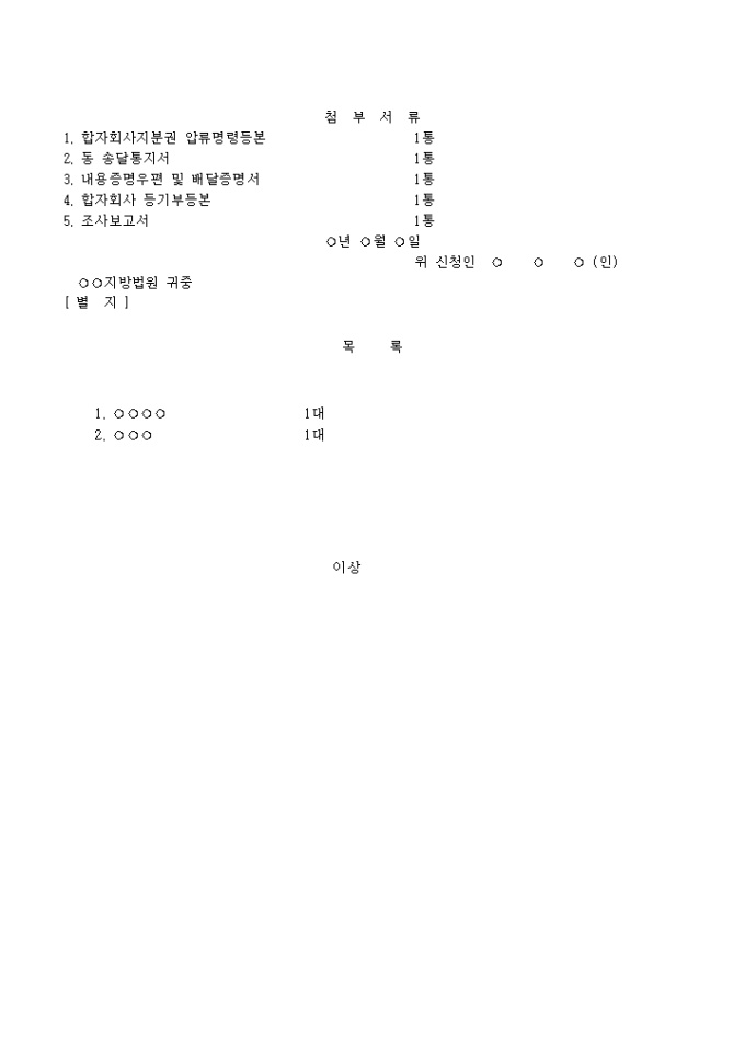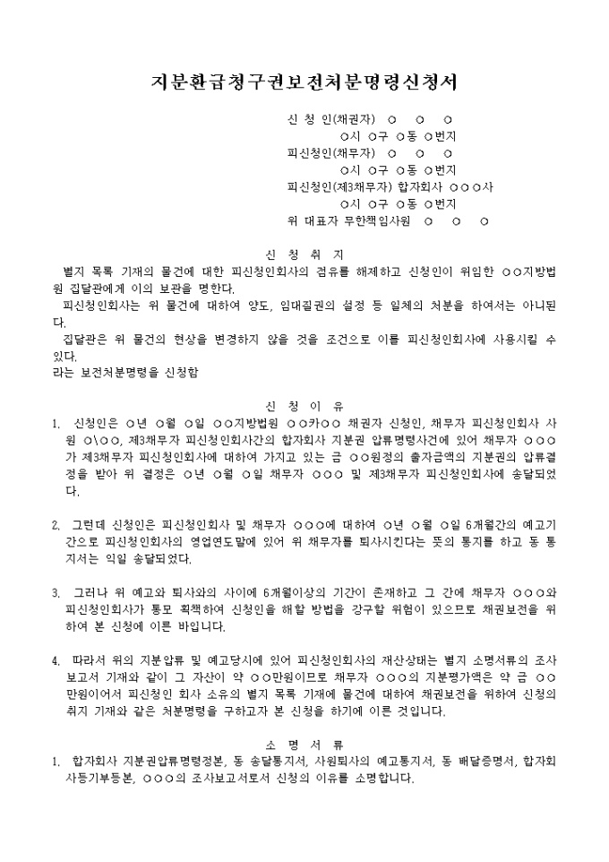 9,000원/월별지 목록 기재의 물건에 대한 피신청인회사의 점유를 해제하고 신청인이 위임한 방법원 집달관에게 이의 보관을 명할 때 사용하는 지분환급청구권보전처분명령신청서 양식입니다.