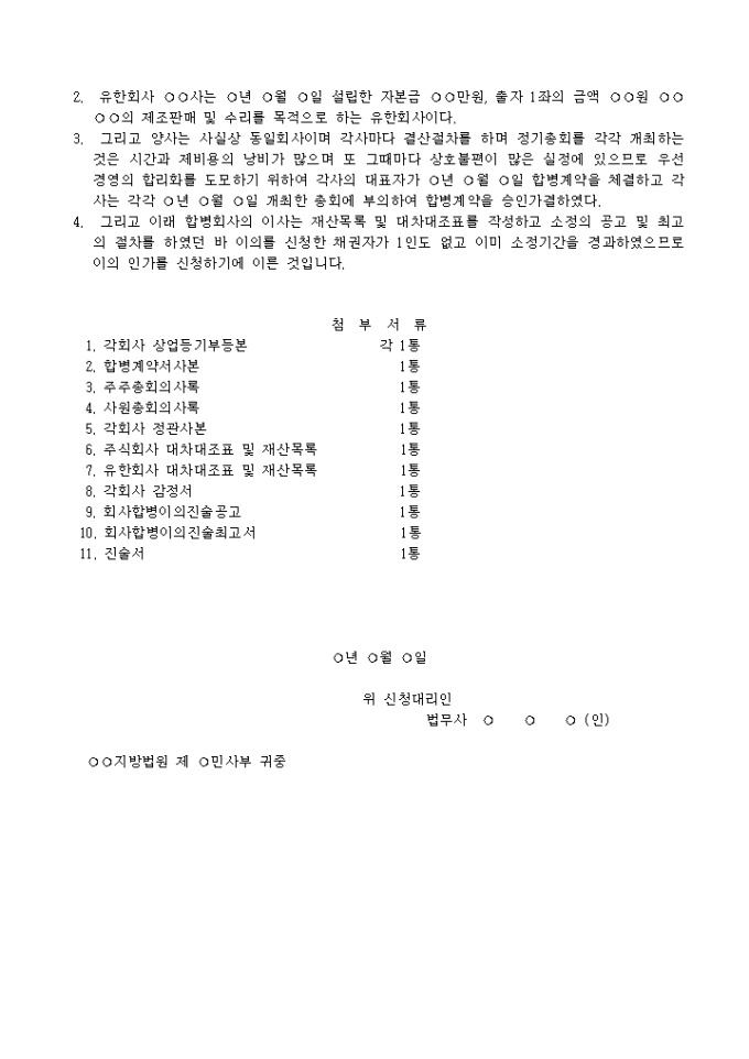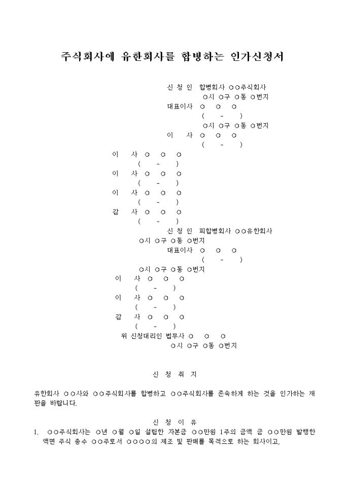 9,000원/월유한회사 ○○사와 ○○주식회사를 합병하고 ○○주식회사를 존속하게 하는 것을 인가하는 재판을 신청할 때 사용하는 합병인가신청서양식입니다.
