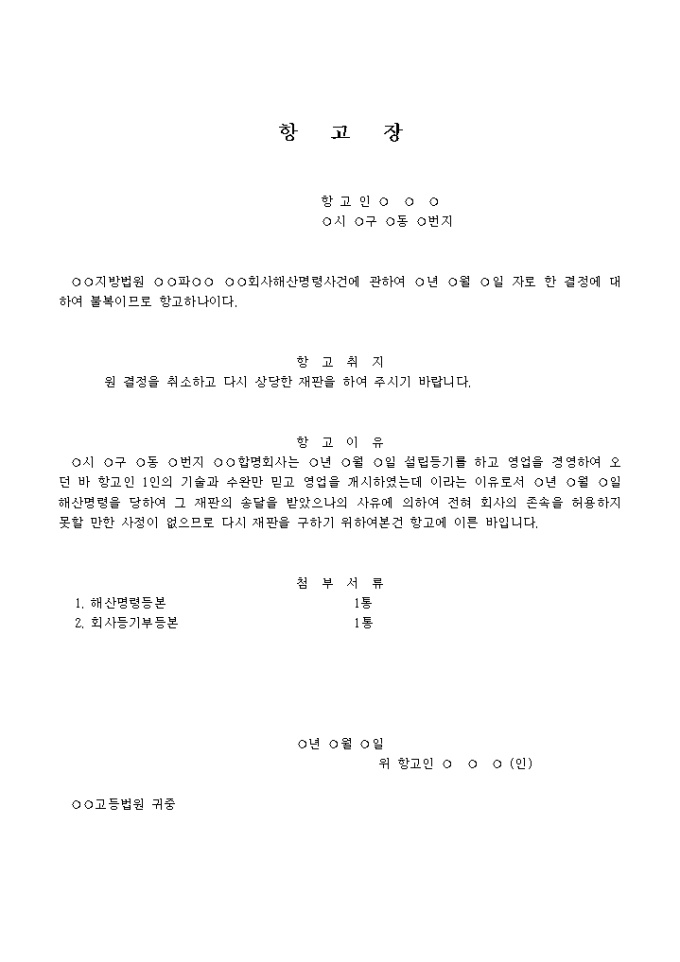 9,000원/월항고장 예제 입니다. 항 고 취 지 원 결정을 취소하고 다시 상당한 재판을 하여 주시기 바랍니다. 항 고 이 유 ○시 ○구 ○동 ○번지 ○○합명회사는 ○년 ○월 ○일 설립등기를 하고 영업을 경영하여 오던 바 항고인 1인의 기술과 수완만 믿고 영업을 개시하였는데 이라는 이유로서 ○년 ○월 ○일 해산명령을 당하여 그 재판의 송달을 받았으나 의 사유에 의하여 전혀 회사의 존속을 허용하지 못할 만한 사정이 없으므로 다시 재판을 구하기