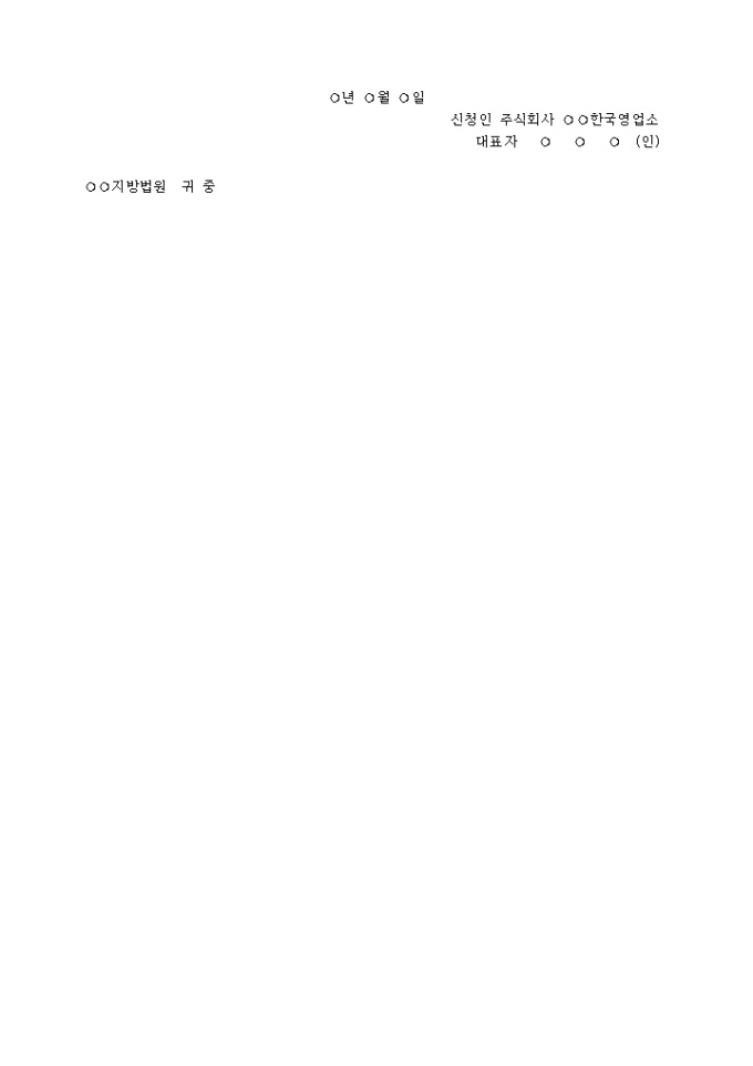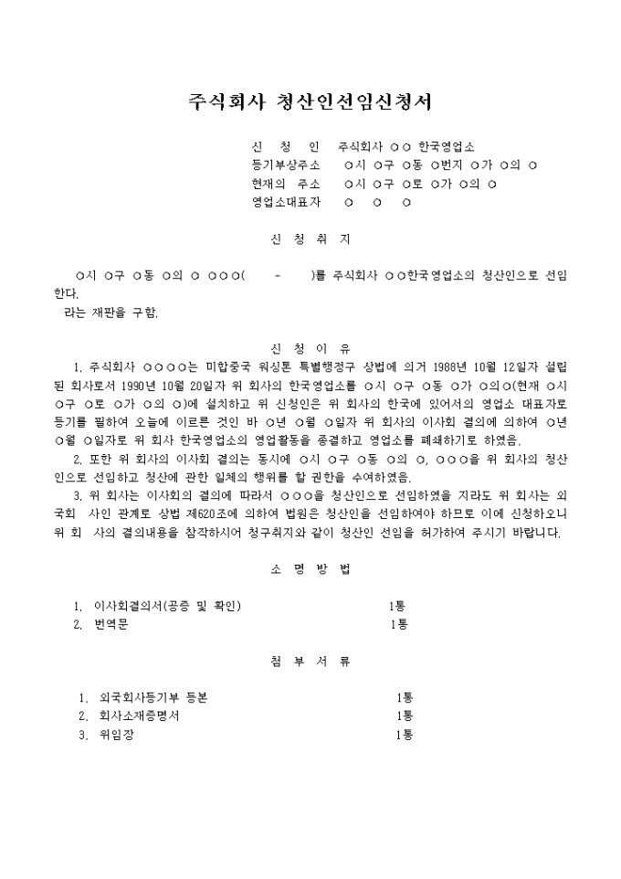 1. 주식회사 는 미합중국 워싱톤 특별행정구 상법에 의거 1988년 10월 12일자 설립된 회사로서 1990년 10월 20일자 위 회사의 한국영업소를 시 구 동 가 의 (현재 시 구 로 가 의 )에 설치하고 위 신청인은 위 회사의 한국에 있어서의 영업소 대표자로 등기를 필하여 오늘에 이르른 것인 바 년 월 일자 위 회사의 이사회 결의에 의하여 년 월 일자로 위 회사 한국영업소의 영업활동을 종결하고 영업소를 폐쇄하기로 하였음.
