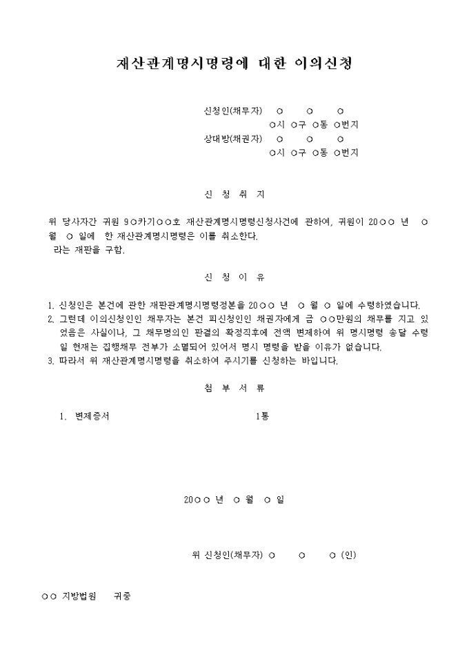 9,000원/월이의신청서 예제 입니다. 신 청 취 지 위 당사자간 귀원 9 카기 호 재산관계명시명령신청사건에 관하여 , 귀원이 20 년 월 일에 한 재산관계명시명령은 이를 취소한다. 라는 재판을 구함. 신 청 이 유 1. 신청인은 본건에 관한 재판관계명시명령정본을 20 년 월 일에 수령하였습니다. 2. 그런데 이의신청인인 채무자는 본건 피신청인인 채권자에게 금 만원의 채무를 지고 있었음은 사실이나