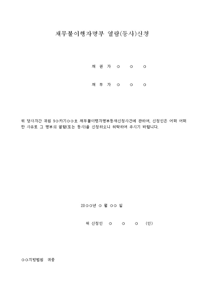 위 당사자간 귀원 9○카기○○호 채무불이행자명부등재신청사건에 관하여, 신청인은 어떠 어떠한 사유로 그 명부의 열람(또는 등사)을 신청하오니 허락하여 주시기 바랍니다.