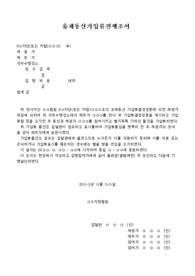 9,000원/월가압류집행조서 입니다. 위 당사자간 법원 9 카단(또는 카합) 호의 유체동산 가압류결정정본에 의한 채권자 위임에 의하여 위 직무수행장소에서 채무자 를 만나 위 가압류결정정본을 제시하고 가압류할 뜻을 고지한 후 동인과 채권자 를 참여시키고 별지목록 기재의 물건을 가압류하였다. 위 가압류 물건은 집달관이 점유하고 표시를하여 가압류물임을 명백히 한 후 채권자의 승낙을 얻어 채무자에게 보관시켰다. , ...