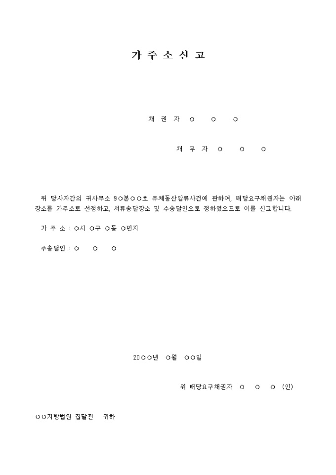 9,000원/월가주소신고서 입니다. 위 당사자간의 귀사무소 9○본○○호 유체동산압류사건에 관하여 , 배당요구채권자는 아래장소를 가주소로 선정하고, 서류송달장소 및 수송달인으로 정하였으므로 이를 신고합니다 ...