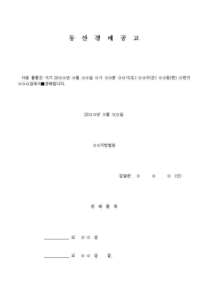 9,000원/월경매공고서 입니다. 다음 물품은 서기 20 년 월 일 시 분 시(도) 구(군) 동(면) 번지 집에서 경매합니다. ...