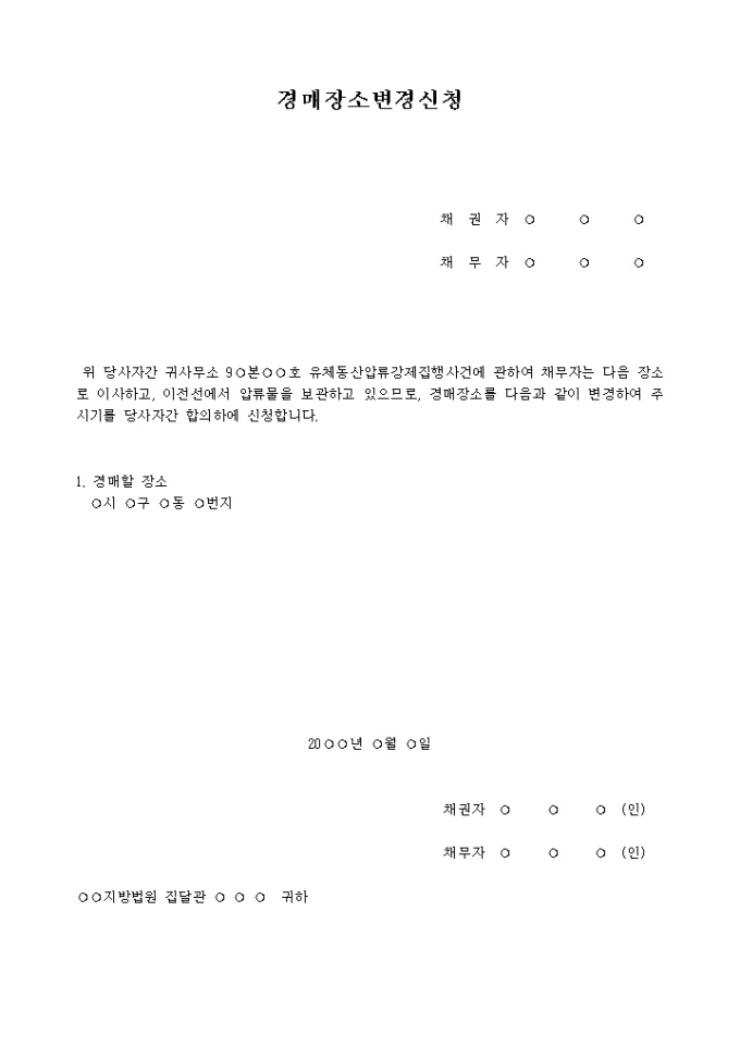 위 당사자간 귀사무소 9○본○○호 유체동산압류강제집행사건에 관하여 채무자는 다음 장소로 이사하고, 이전선에서 압류물을 보관하고 있으므로, 경매장소를 다음과 같이 변경하여 주시기를 당사자간 합의하에 신청합니다.