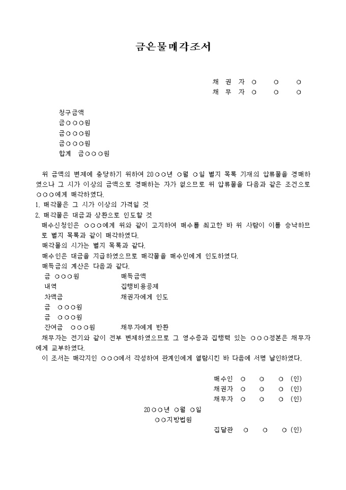 9,000원/월금은물매각조서 입니다. 위 금액의 변제에 충당하기 위하여 20 년 월 일 별지 목록 기재의 압류물을 경매하였으나 그 시가 이상의 금액으로 경매하는 자가 없으므로 위 압류물을 다음과 같은 조건으로 에게 매각하였다. 1. 매각물은 그 시가 이상의 가격일 것 2. 매각물은 대금과 상환으로 인도할 것 매수신청인은 에게 위와 같이 고지하여 매수를 최고한 바 위 사람이 이를 승낙하므로 별지 목록과 같이 매각하였다. ...