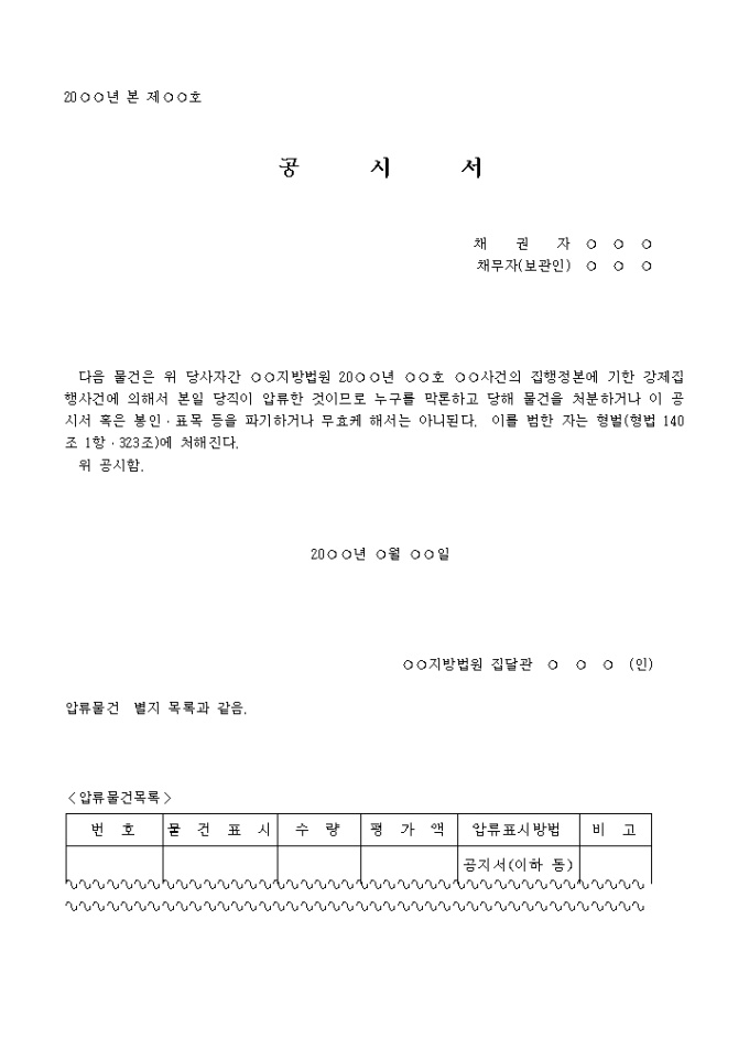 다음 물건은 위 당사자간 지방법원 20 년 호 사건의 집행정본에 기한 강제집행사건에 의해서 본일 당직이 압류한 것이므로 누구를 막론하고 당해 물건을 처분하거나 이 공시서 혹은 봉인·표목 등을 파기하거나 무효케 해서는 아니된다. 이를 범한 자는 형벌(형법 140조 1항·323조)에 처해진다.