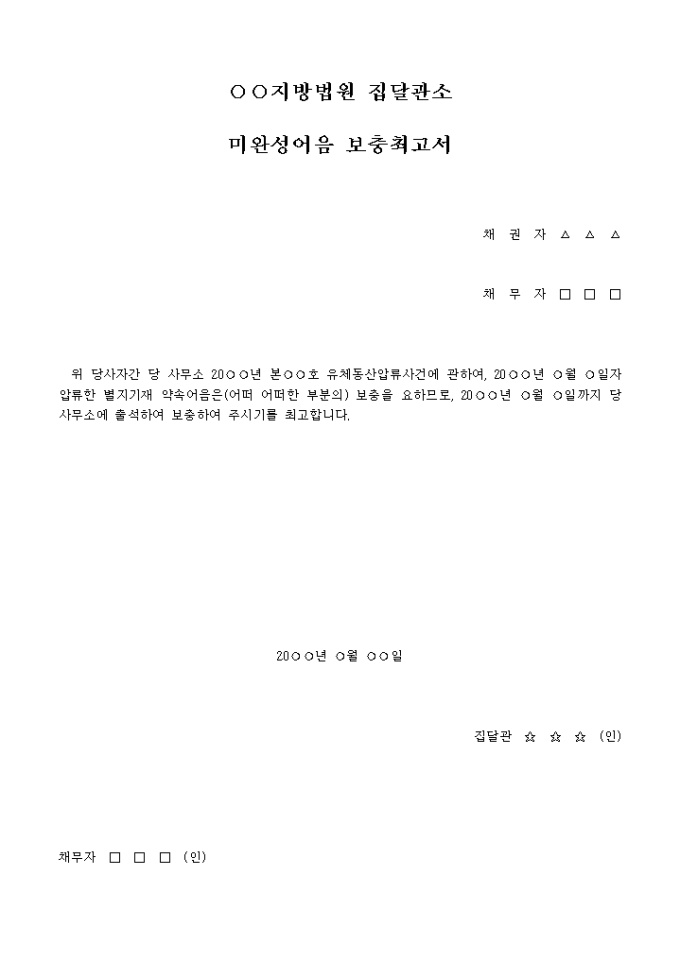 위 당사자간 당 사무소 20○○년 본○○호 유체동산압류사건에 관하여, 20○○년 ○월 ○일자 압류한 별지기재 약속어음은(어떠 어떠한 부분의) 보충을 요하므로, 20○○년 ○월 ○일까지 당사무소에 출석하여 보충하여 주시기를 최고합니다.