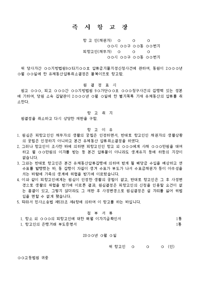 9,000원/월압류금지물을 정하는 재판에 대한 즉시항고장 입니다.