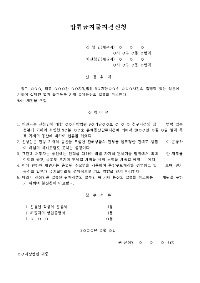 압류금지물지정신청서(채무자의 압류취소신청 예)