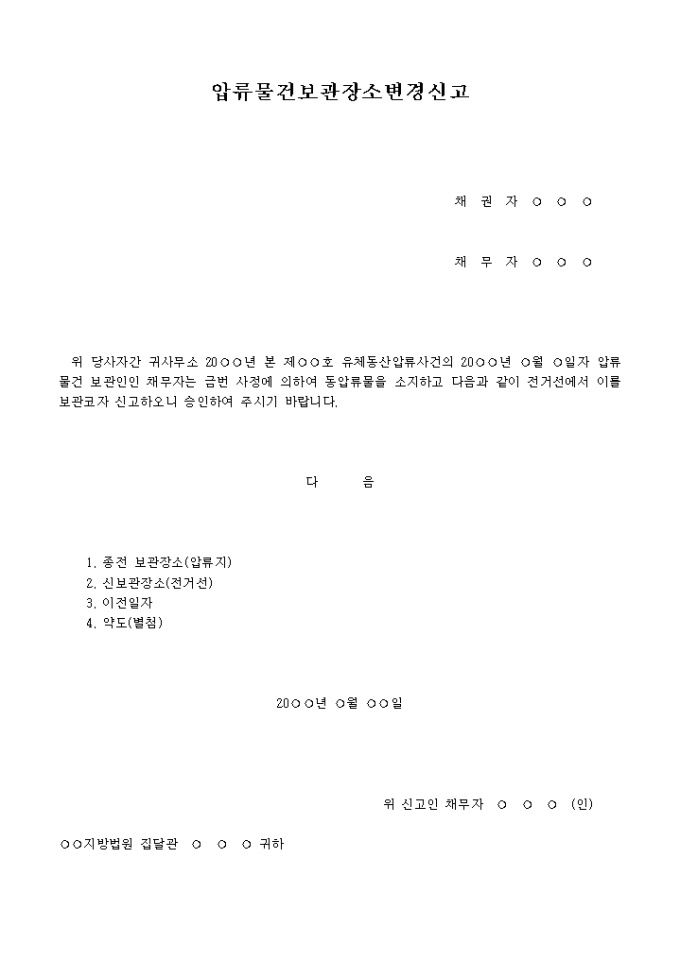 위 당사자간 귀사무소 20○○년 본 제○○호 유체동산압류사건의 20○○년 ○월 ○일자 압류물건 보관인인 채무자는 금번 사정에 의하여 동압류물을 소지하고 다음과 같이 전거선에서 이를 보관코자 신고하오니 승인하여 주시기 바랍니다.