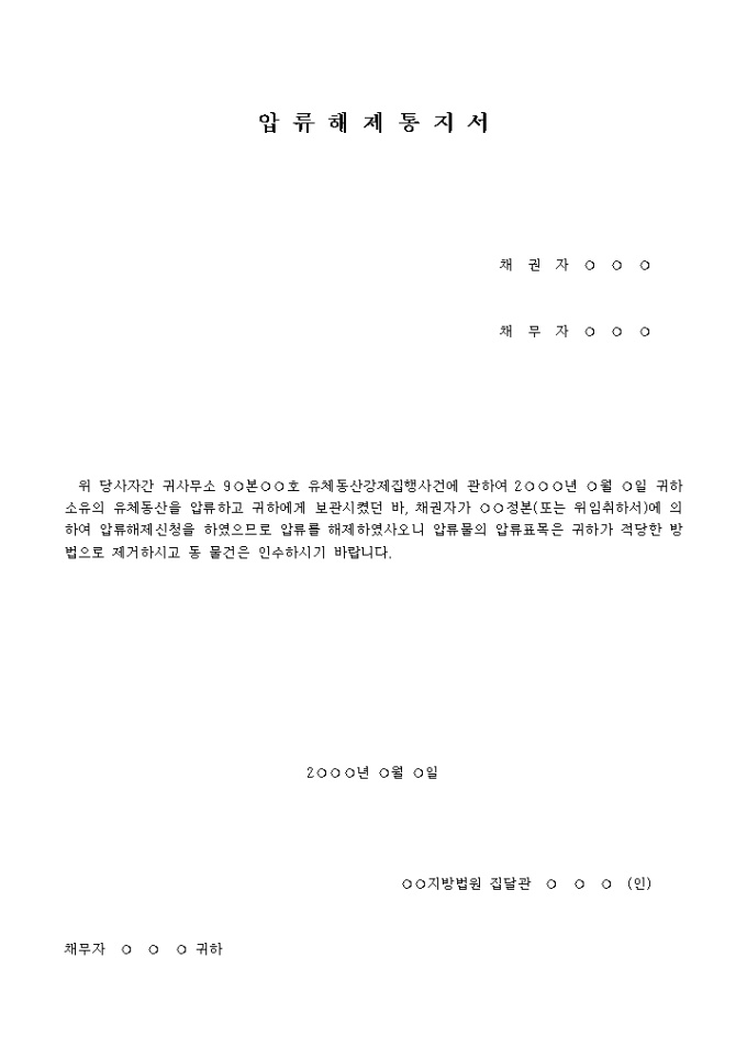 위 당사자간 귀사무소 9○본○○호 유체동산강제집행사건에 관하여 2○○○년 ○월 ○일 귀하 소유의 유체동산을 압류하고 귀하에게 보관시켰던 바, 채권자가 ○○정본(또는 위임취하서)에 의하여 압류해제신청을 하였으므로 압류를 해제하였사오니 압류물의 압류표목은 귀하가 적당한 방법으로 제거하시고 동 물건은 인수하시기 바랍니다.