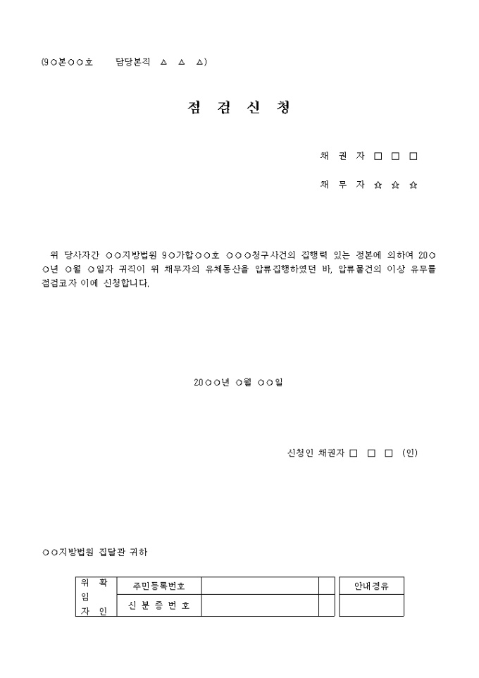 9,000원/월점검신청서 입니다. 위 당사자간 ○○지방법원 9○가합○○호 ○○○청구사건의 집행력 있는 정본에 의하여 20○○년 ○월 ○일자 귀직이 위 채무자의 유체동산을 압류집행하였던 바, 압류물건의 이상 유무를 점검코자 이에 신청합니다. , ,