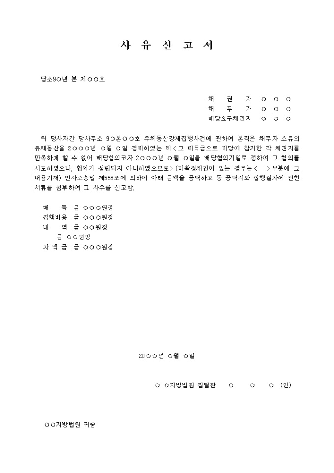 위 당사자간 당사무소 9○본○○호 유체동산강제집행사건에 관하여 본직은 채무자 소유의 유체동산을 2○○○년 ○월 ○일 경매하였는 바〈그 매득금으로 배당에 참가한 각 채권자를 만족하게 할 수 없어 배당협의코자 2○○○년 ○월 ○일을 배당협의기일로 정하여 그 협의를 시도하였으나, 협의가 성립되지 아니하였으므로〉(미확정채권이 있는 경우는〈 〉부분에 그 내용기재) 민사소송법 제556조에 의하여 아래 금액을 공탁하고 동 공탁서와 집행절차에 관한 서류를 첨부하여 그 사유를 신고함.