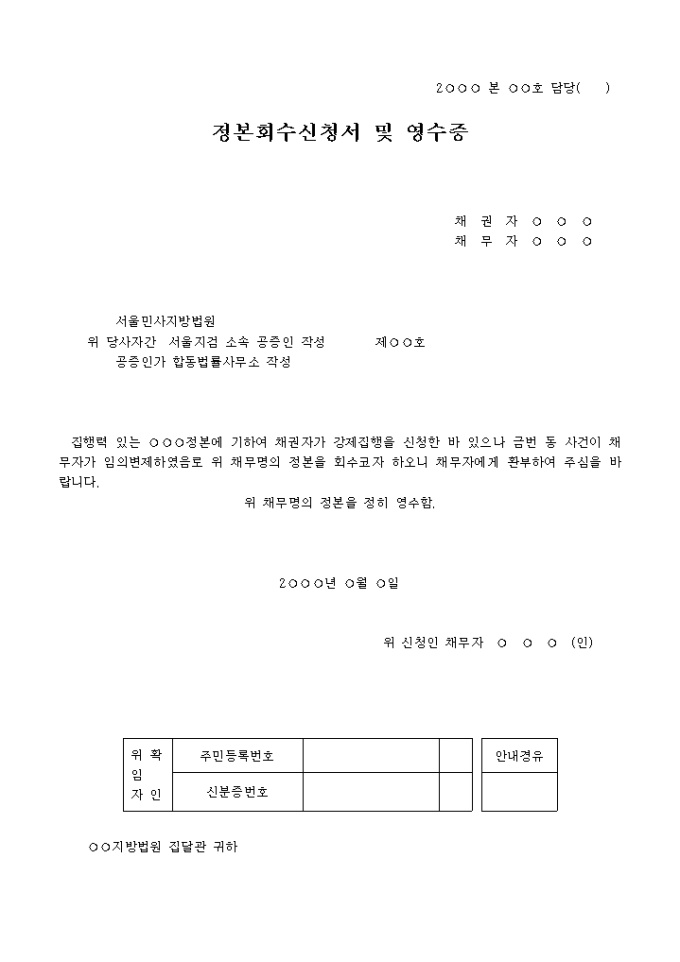 집행정본회수신청 및 영수증서