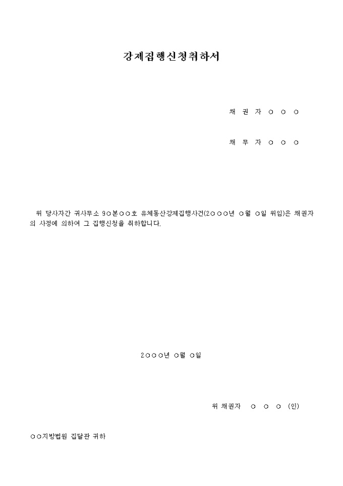 위 당사자간 귀사무소 9○본○○호 유체동산강제집행사건(2○○○년 ○월 ○일 위임)은 채권자의 사정에 의하여 그 집행신청을 취하합니다.