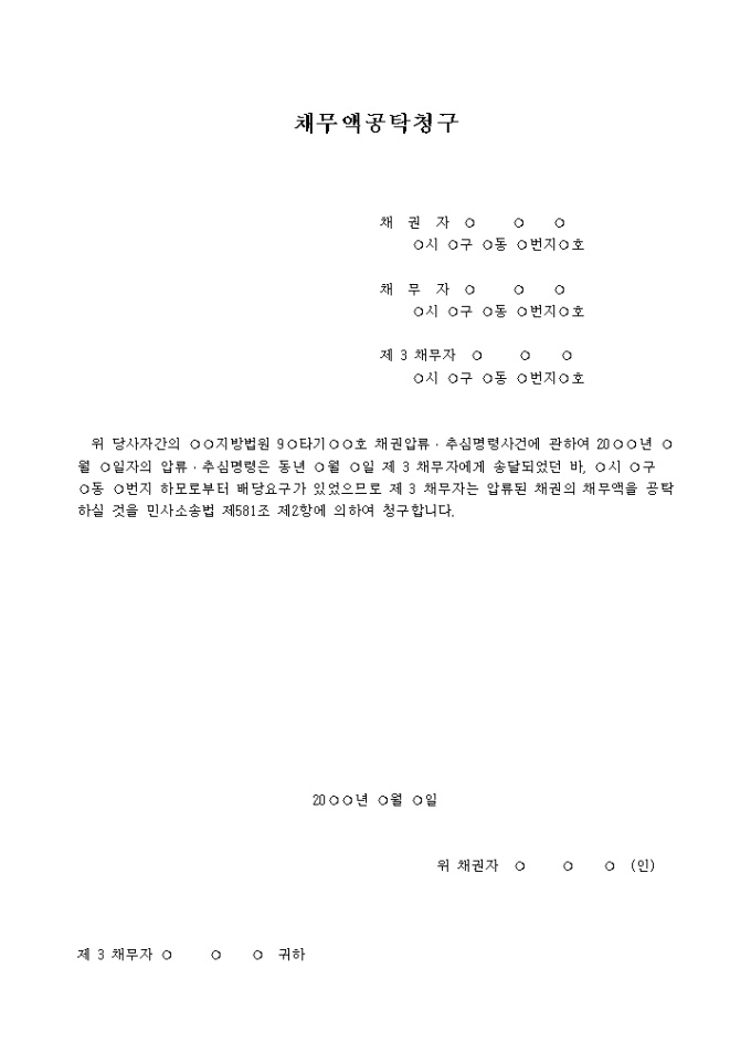 위 당사자간의 ○○지방법원 9○타기○○호 채권압류․추심명령사건에 관하여 20○○년 ○월 ○일자의 압류․추심명령은 동년 ○월 ○일 제 3 채무자에게 송달되었던 바, ○시 ○구 ○동 ○번지 하모로부터 배당요구가 있었으므로 제 3 채무자는 압류된 채권의 채무액을 공탁하실 것을 민사소송법 제581조 제2항에 의하여 청구합니다.
