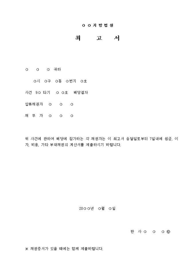 최고서 입니다. 위 사건에 관하여 배당에 참가하는 각 채권자는 이 최고서 송달일로부터 7일내에 원금, 이자, 비용, 가타 부대채권의 계산서를 제출하시기 바랍니다. ...